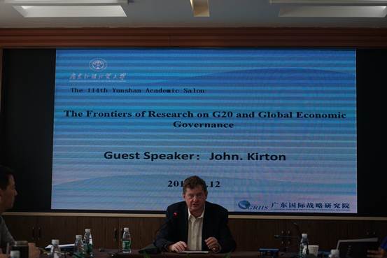 5月12日,由21世纪海上之路协同创新中心主办的海丝国际智库论坛系列活动云山学术沙龙第114期在广东国际战略研究院举行。加拿大多伦多大学John Kirton教授作为主讲嘉宾,发表了题为"G20和全球经济治理的前沿研究"的学术演讲。沙龙由21世纪海上丝绸之路协同创新中心理事会秘书长、广东国际战略研究院秘书长李青教授主持。
