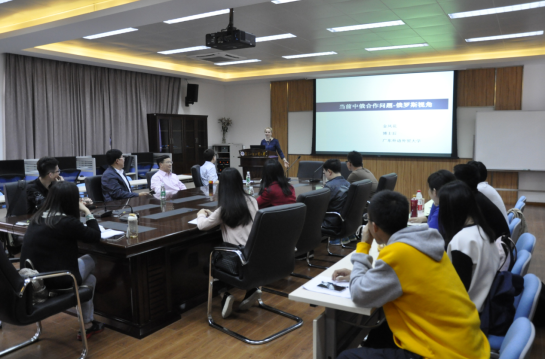 2016年3月31日,云山学术沙龙第106期讲座“当前中俄合作问题:俄罗斯视角”在六教B415举行。本次讲座的主讲人是目前在广外攻读博士后的俄罗斯学者金凤花博士。讲座由欧洲研究中心主任陈寒溪教授主持。留学生教育学院院长梁学宏教授、法学院副院长王树春教授、俄语专业博士生、欧洲学专业研究生参加了讲座。
