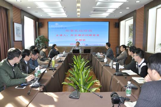 讲座开始,吴参赞就以会议室的座位安排为例讲解了注意事项,并调动了现场气氛。吴参赞表示,当我们参与外事活动时,我们的一言一行都代表着国家,因此每一件事都需要特别注意,尤其是细节问题,应做到从容得体、热情适度,不但要充分尊重其他人,还要自尊自爱。接下来,吴参赞从言行举止、仪容仪表、用餐礼仪、互赠礼物、交往禁忌等几个方面举例说明了外事礼仪的注意事项。吴参赞生动有趣的发言极好地调动了现场气氛。各位老师和研究员都纷纷举出自己或身边的例子,参与到外事礼仪注意事项的讨论中来。