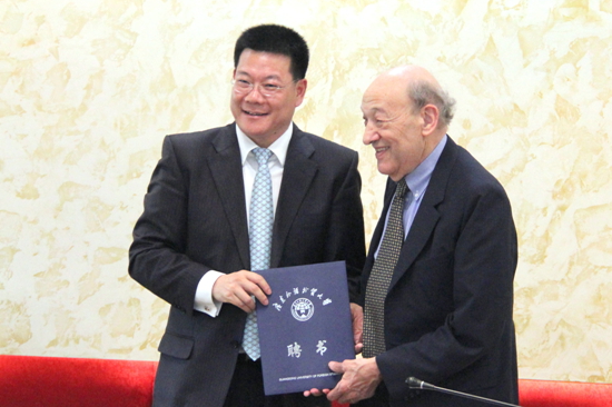 4月4日,美国哈佛大学教授、费正清东亚中心前主任傅高义受广东国际战略研究院邀请来访我校。傅高义被认为是唯一一位对中日两国事务都精通的学者,在2013年3月23日举行的第五届世界中国学论坛上被授予“世界中国学贡献奖”。我校是傅高义来中国演讲行程中广东省的最后一站,受到了校党委书记隋广军、校长仲伟合、副校长顾也力以及广大师生的热烈欢迎。隋广军在贵宾厅与其会谈,仲伟合向其颁发 “荣誉教授”聘书。