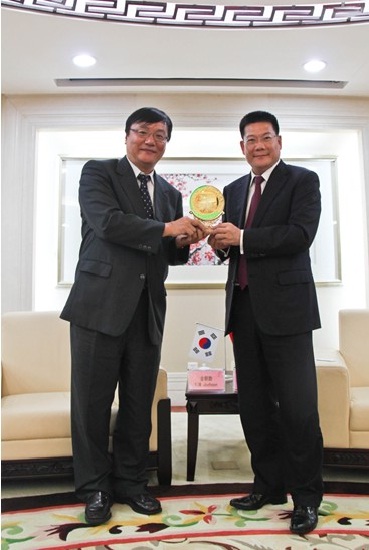 讲座结束后,我校校长仲伟合在贵宾室接待贵宾金朝勋,赠送纪念品并合影留念。