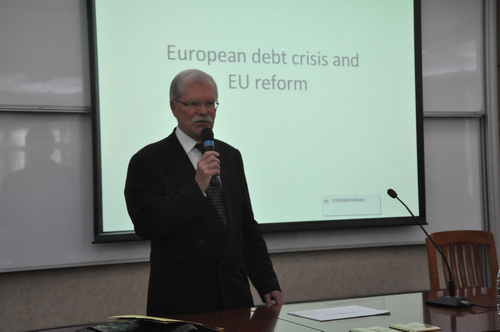 2012年5月9日是第62个“欧洲日”,也是中欧建交37周年的纪念日。在这一天,欧盟前对外事务首席顾问、前驻中国与蒙古大使、前驻埃及和阿拉伯联盟大使安高胜博士(Dr. Klause Ebermann)受聘欧洲研究中心首位学术顾问,并在“欧洲论坛”主讲题为“欧债危机与欧盟治理改革”的讲座。活动在北校六教B103室举行。校党委副书记、欧洲研究中心学术委员会主席陈建平,广东国际战略研究院秘书长李青、国际合作交流处副处长梁洁、欧洲研究中心主任蔡红以及欧洲学硕导、欧盟让莫内课程项目主持人王小海以及全体欧洲学硕士研究生与部分法律硕士研究生见证了受聘仪式。