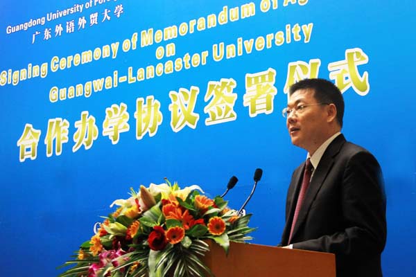 仲伟合首先致辞,对来宾表示感谢和欢迎。他提到广外与兰卡斯特大学有着悠久的合作历史,两校从20世纪90年代初至今的合作中已经积累了丰富的经验。广外和兰卡斯特大学合作办学将有利于“广外-兰卡斯特大学”引进先进办学理念,开阔国际视野。“广外-兰卡斯特大学”的建立将对高等教育新模式的探索产生深远影响,将成为广外国际化建设的一个新里程碑。仲伟合对广东省政府、广州市政府、广东省教育厅的大力支持表示感谢。最后,他强调广外和兰卡斯特大学的合作办学将为创建“幸福广东”做出贡献。
