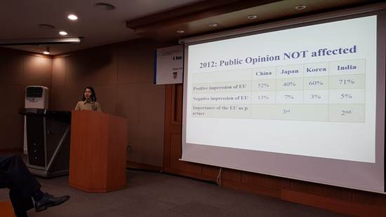 3月22日,赖雪仪博士在“欧盟近年面对的危机和其合作伙伴的认知” 讨论环节做了针对中、日、韩、印四个欧盟亚洲战略伙伴对其认知的报告。赖博士分享了其参与的“亚洲眼中的欧盟”研究项目的研究成果。