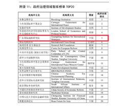 近日,浙江大学信息资源分析与应用研究中心发布了《全球智库影响力评价报告2020》(以下简称《智库报告》),广东省共有2家智库入选,其中广东国际战略研究院在全球智库榜单TOP100中排名42,在中国智库榜单TOP100中排名14。在全球智库影响力9个分领域榜单中,4个榜单进入TOP20: 全球政府治理领域智库TOP20排名5,全球综合类智库TOP20排名13,全球国家安全领域智库TOP20与社会政策领域TOP20均排名17。