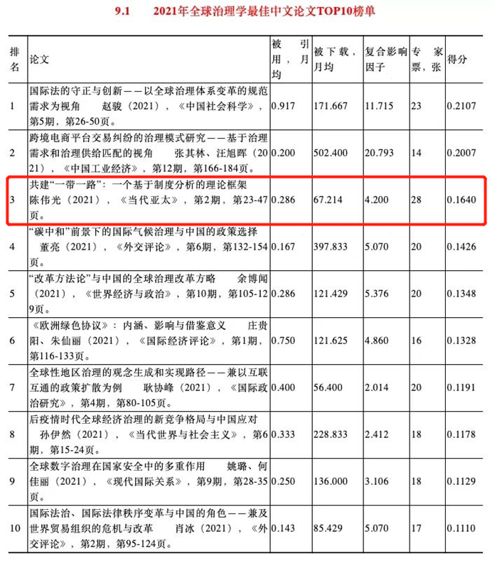近日,我院高级研究员陈伟光教授撰写的论文《共建“一带一路”:一个基于制度分析的理论框架》入选“2021年全球治理学最佳中文论文TOP10榜单”,我院孙楚仁教授与西南财经大学国际商学院硕士研究生何茹、博士研究生刘雅莹合作撰写的论文《对非援助与中国企业对外直接投资》入选“2021投资学最佳中文论文TOP10榜单”。