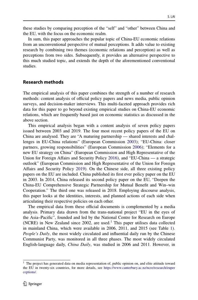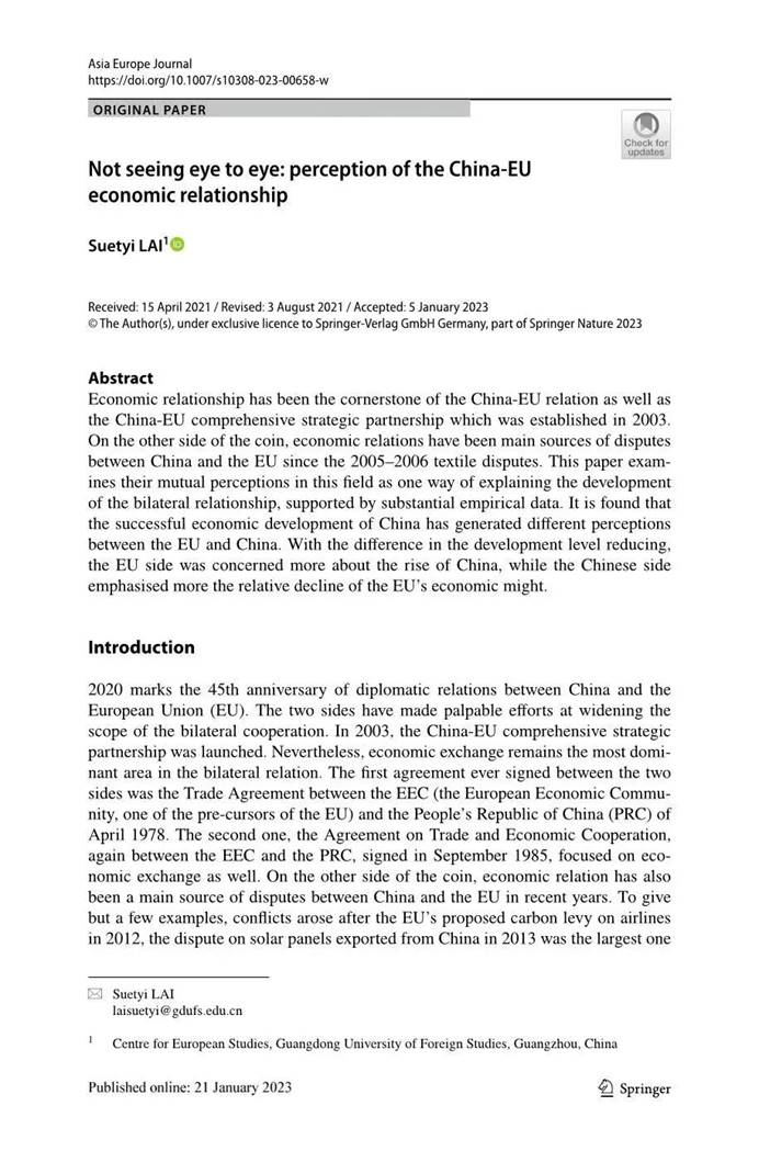 On 21 January, the paper 《Not seeing eye to eye: perception of the China-EU economic relationship》authored by Suetyi LAI was published on Asia Europe Journal.