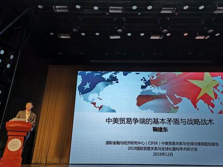 清华大学紫光金融学讲席教授鞠建东发表题为“中美贸易争端的基本矛盾与战略战术”的主旨演讲