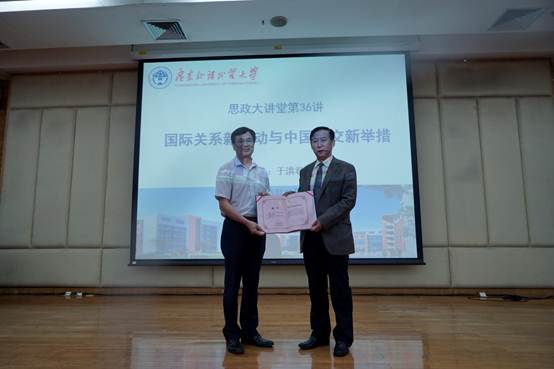 2019年5月23日,原中联部副部长于洪君受邀来校主讲思政大讲堂第36讲。本次大讲堂的主题为:国际关系新变动与中国外交新举措。广东外语外贸大学副校长何传添为于洪君颁发客座教授聘书。原广东省外办主任、非洲研究院院长傅朗,非洲研究院副院长刘继森、广东国际战略研究院副秘书长商杰强、校党委学生工作部副部长叶开,师生代表参加大讲堂。