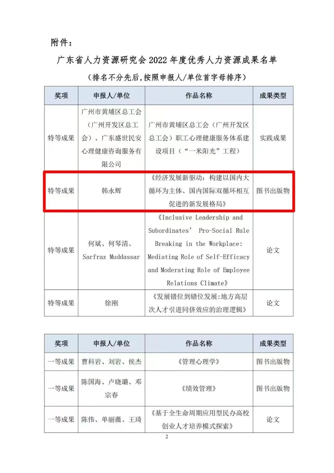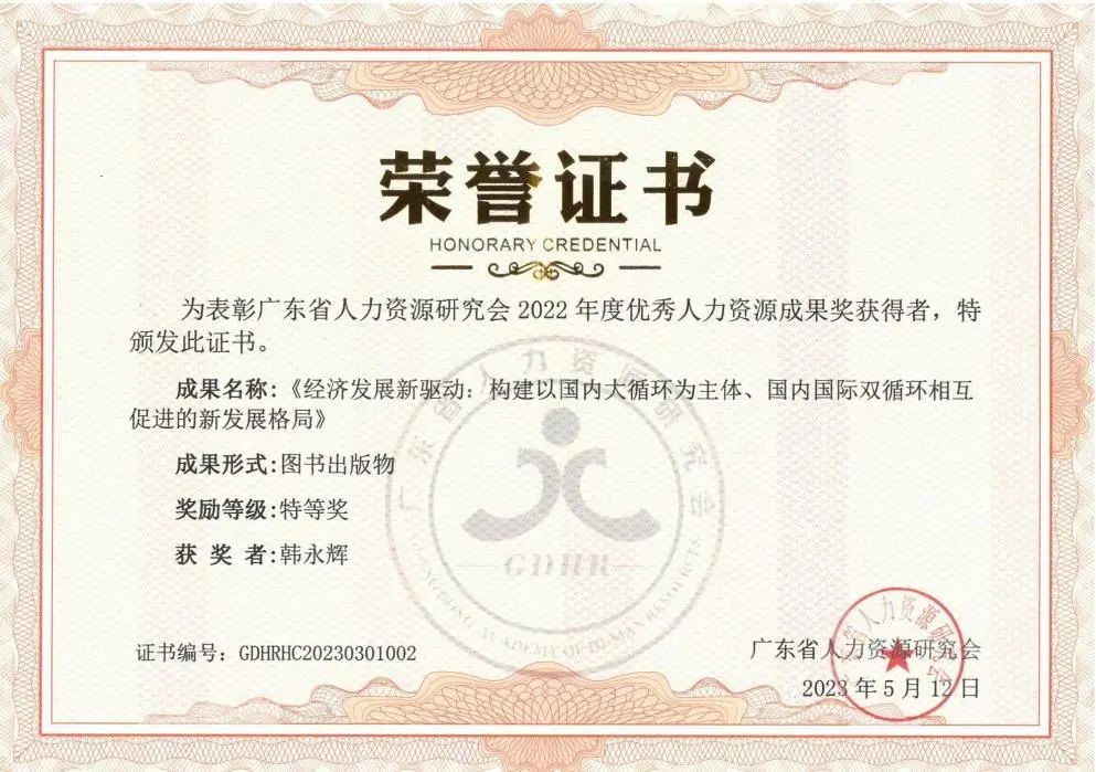 近期,在“广东省人力资源研究会2022年度优秀人力资源成果”评选中,我院韩永辉教授专著《经济发展新驱动:构建以国内大循环为主体、国内国际双循环相互促进的新发展格局》荣获特等奖。