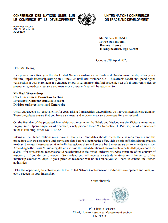 ♦ In May, Ms Huang Shexiu was offered a position as an intern in the United Nations Conference on Trade and Development (UNCTAD)