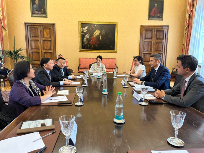 李云明一行拜访了都灵大学中国研究中心并进行了工作会谈,双方就开展中意关系合作研究、联合开展以实现“共同富裕”为主题的学生暑期夏令营、学生交换及联合培养项目、欧亚校园项目、联合申报中外合作办学项目等进行深入交流。
