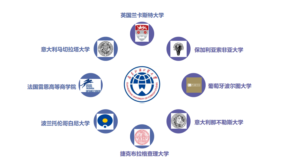 “欧亚校园”国际化创新人才培养项目是国家留学基金委员会批准的广东外语外贸大学联合欧洲9所知名院校(英国兰卡斯特大学、法国雷恩商学院、意大利那不勒斯东方大学、葡萄牙波尔图大学、保加利亚索菲亚大学、波兰托伦哥白尼大学、波兰波兹南密茨凯维奇大学、捷克查理大学、意大利马切拉塔大学)共同规划与实施的国际多边教育合作项目。该项目包括“双硕士学位项目”和“联合培养博士生项目”两种培养模式。
