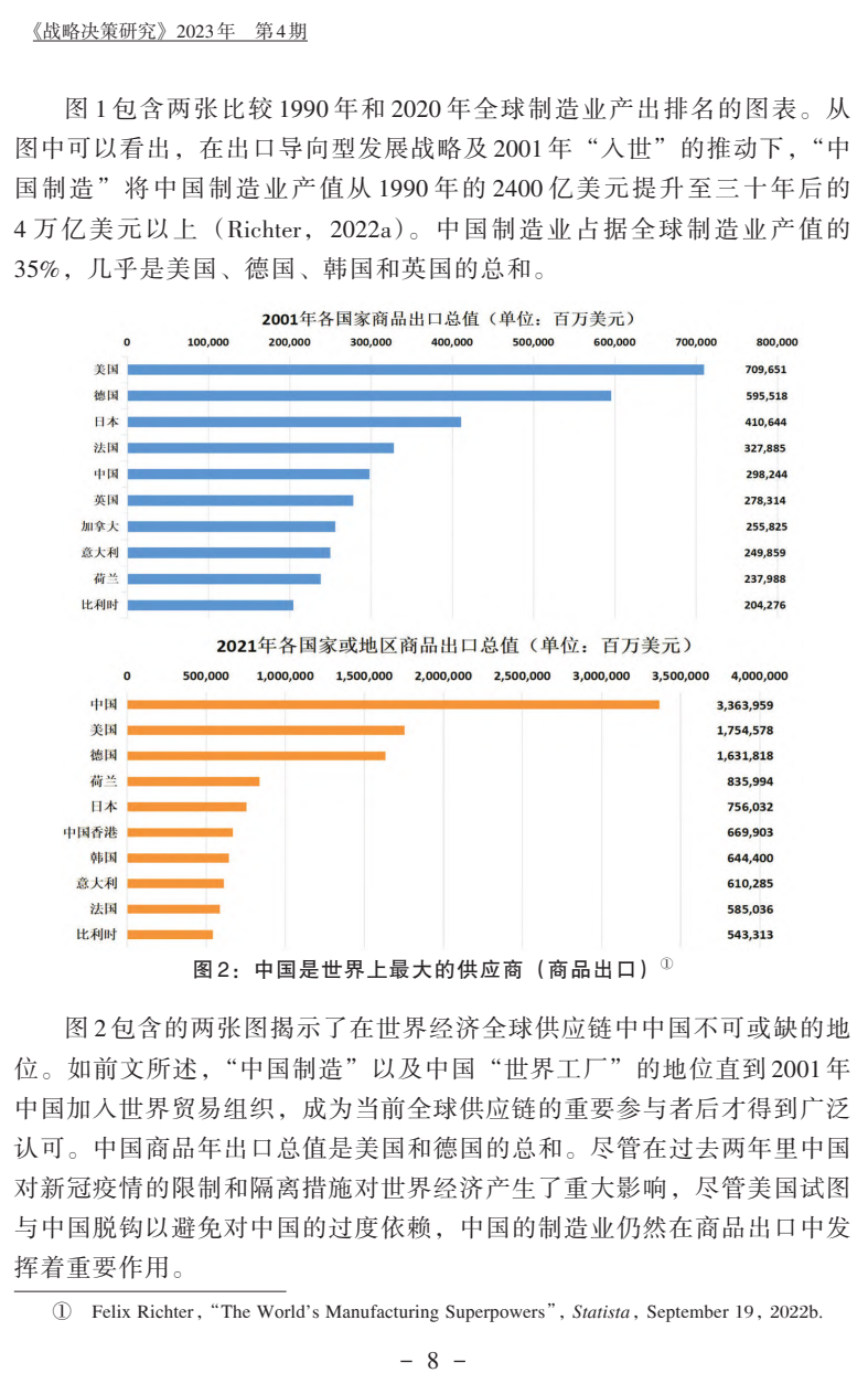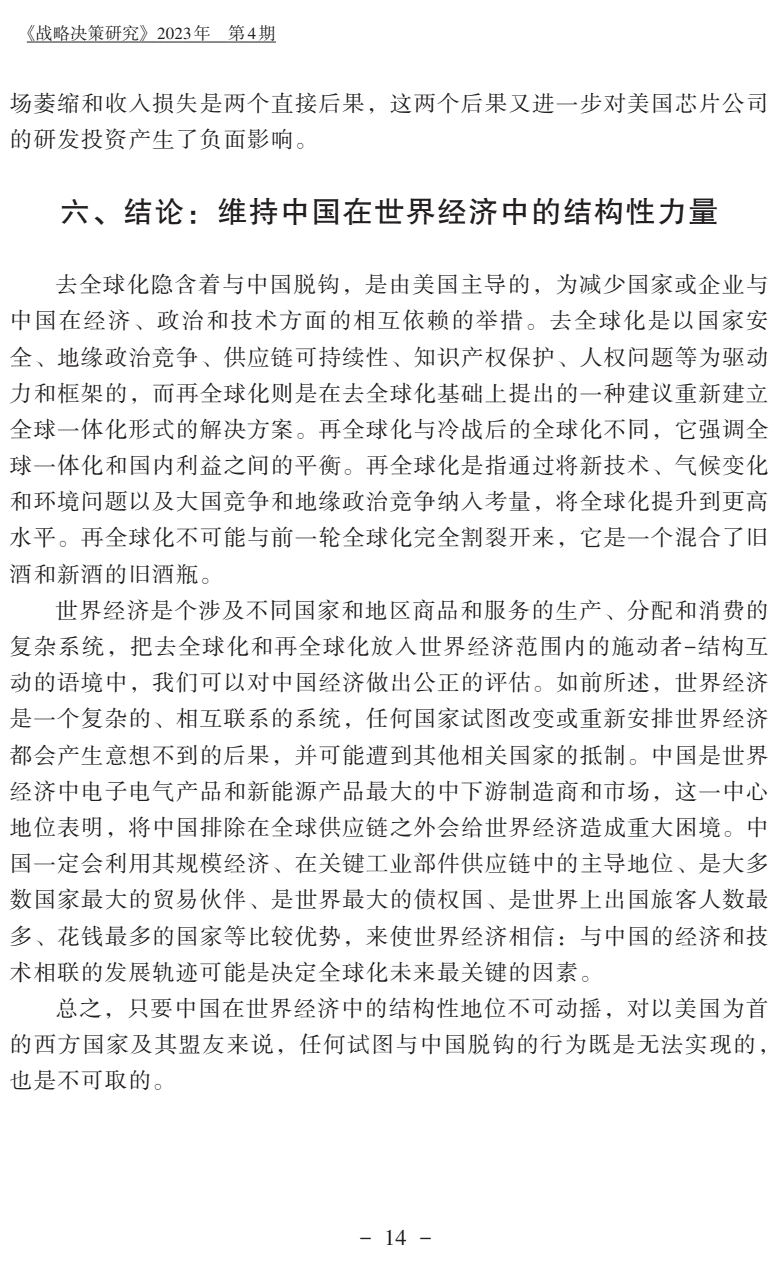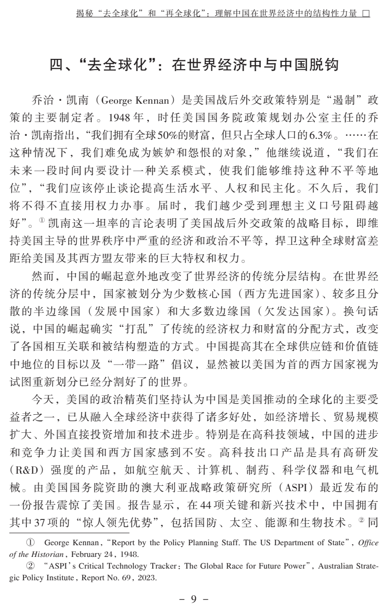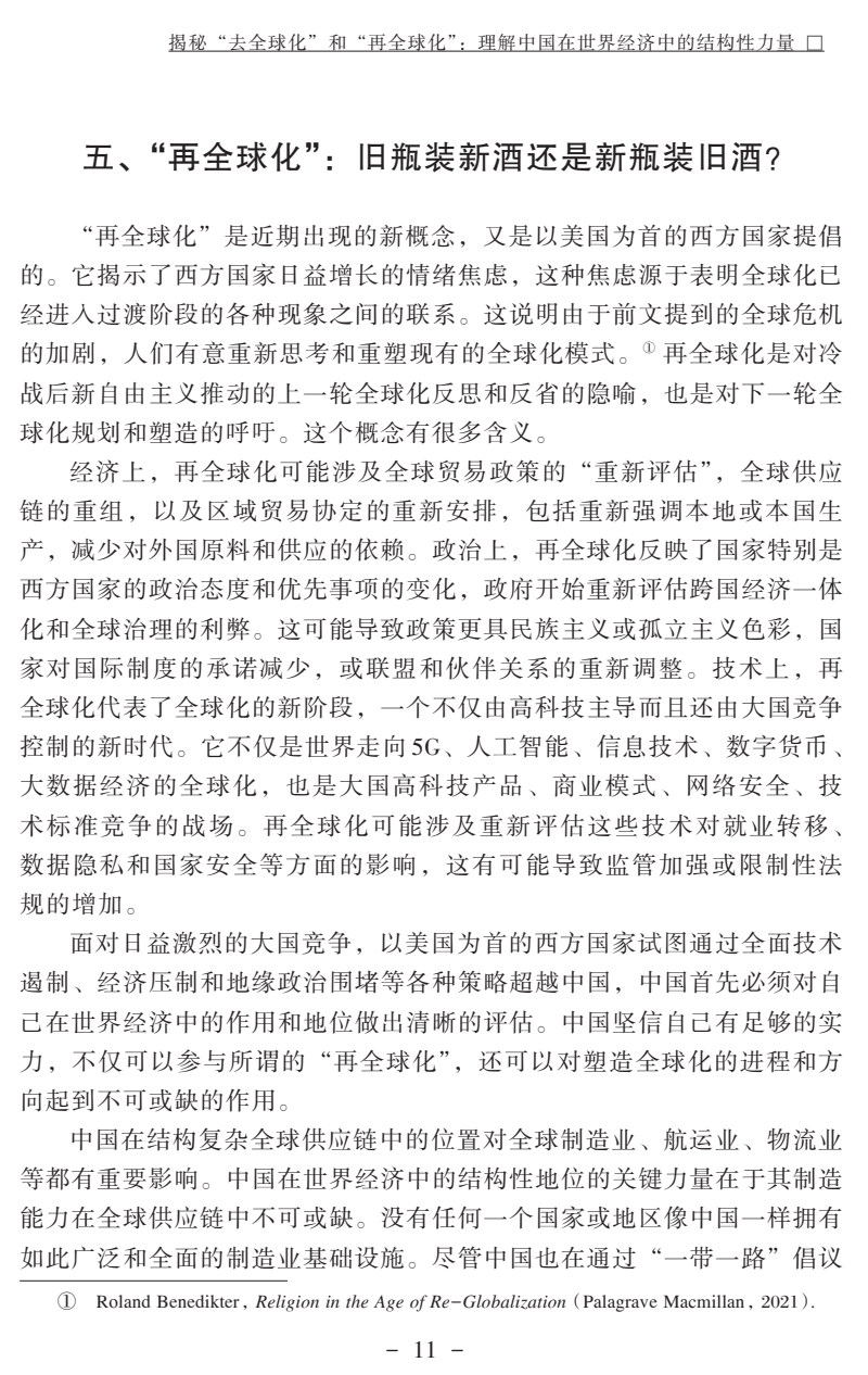 本文认为,可以将去全球化理解为“对华脱钩”或“对华去风险化”的隐性类比,而再全球化则意味着试图重组或修改中国享有优势地位的现有世界经济模式。再全球化似乎代表着一个由高科技竞争和大国竞争主导的全球化新时代。面对挑战与机遇并存的局面,中国一方面要巩固其当前在世界经济中来之不易的结构性地位,另一方面要积极参与塑造正在形成的新经济秩序。