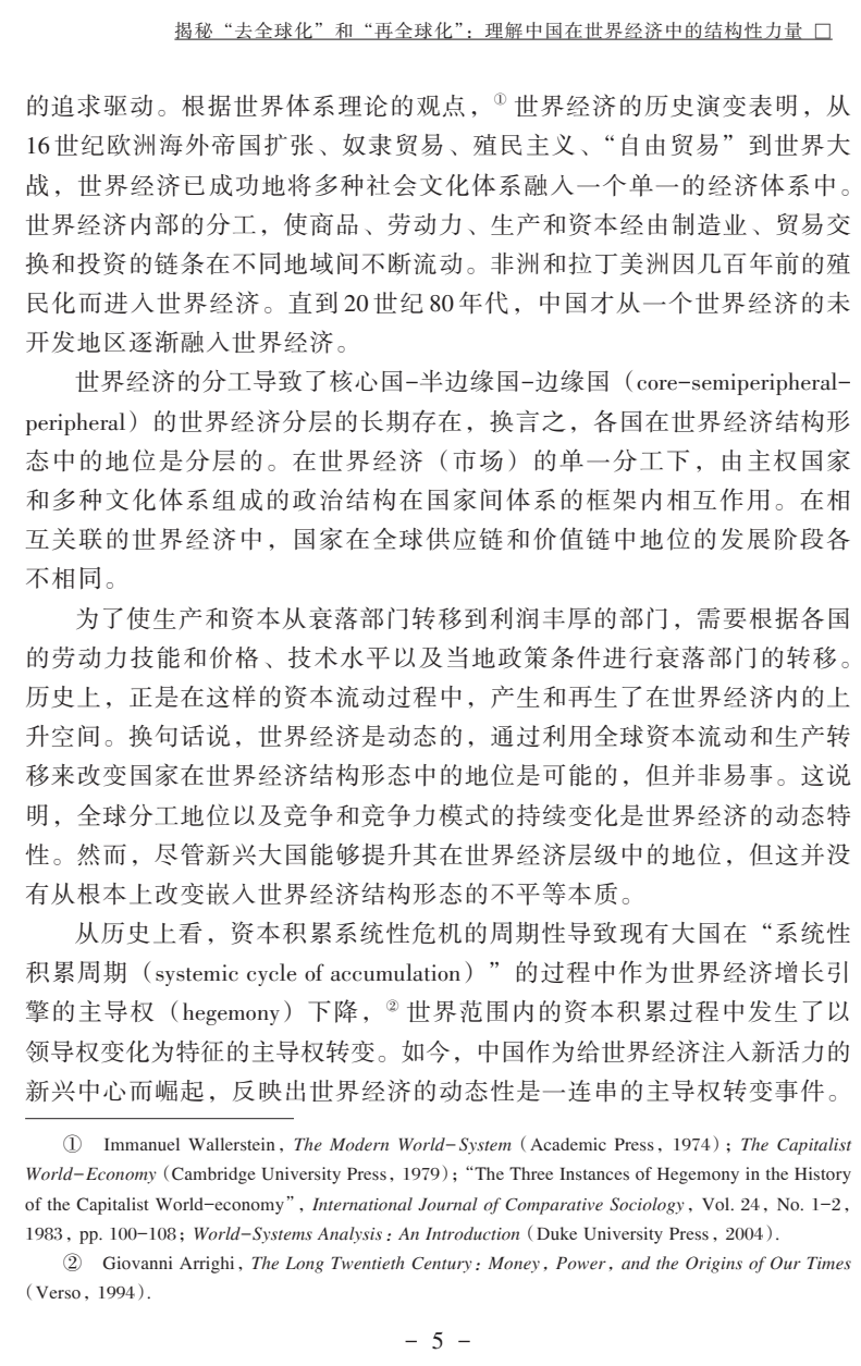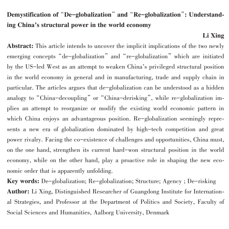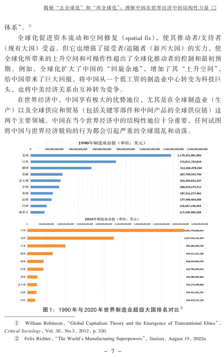本文旨在揭示“去全球化(de-globalization)”和“再全球化 (re-globalization)” 这两个新兴概念的隐含含义。这两个概念由以美国为首的西方国家提出,目的是试图削弱中国在世界经济特別是制造业、贸易和供应链中的优势结构性地位。