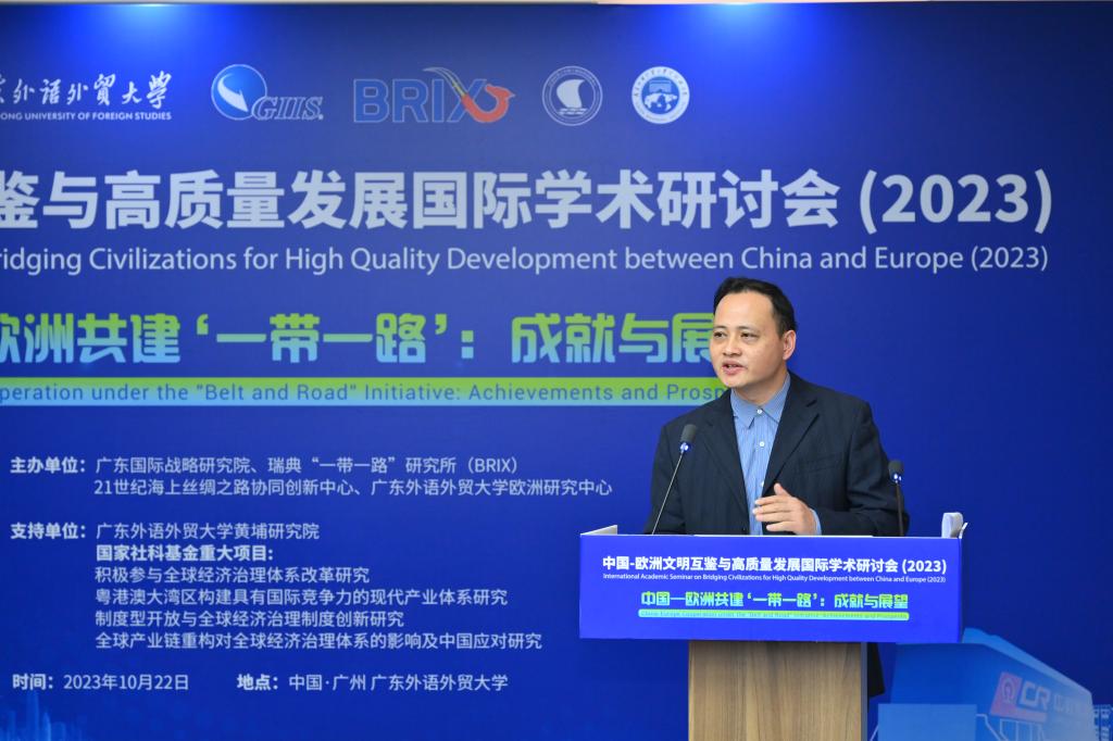 10月22日,中国-欧洲文明互鉴与高质量发展国际学术研讨会在广州顺利召开。本次会议以“中国-欧洲共建‘一带一路’:成就与展望”为主题,由广东国际战略研究院、瑞典“一带一路”研究院、21世纪海上丝绸之路协同创新中心和广东外语外贸大学欧洲研究中心联合主办,由广东外语外贸大学黄埔研究院承办。与会人士围绕共建“一带一路”倡议提出十周年来所取得的巨大成就、国际贡献及未来展望展开了热烈讨论,并从政治、经济、社会人文等不同角度为中欧进一步深化文明交流与合作提出了积极建议。