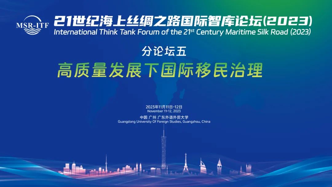 2023年11月11日,21世纪海上丝绸之路国际智库论坛主论坛在广州中新知识城国际会议中心召开。由广东外语外贸大学和广东省民族宗教研究院主办,国际移民研究中心、广东国际战略研究院、21世纪海上丝绸之路协同创新中心承办的“高质量发展下国际移民治理”分论坛在当天下午和晚上召开。会议邀请到联合国国际移民组织驻华代表柯吉佩(Giuseppe Crocetti)先生,广东外语外贸大学刘海春副校长,社会科学文献出版社国别区域分社张晓莉社长,教育部长江学者、云南师范大学周大鸣教授,德国洪堡学者、北京理工大学刘国福教授,山东大学宋全成教授、国家民族事务委员会国际交流司前副司长吴金光高级研究员,及多位国内国际移民研究专家参会,广东省民族宗教研究院、广州出入境边防检查总站、中国人民警察大学、广东外语外贸大学等单位70余位人员参会。