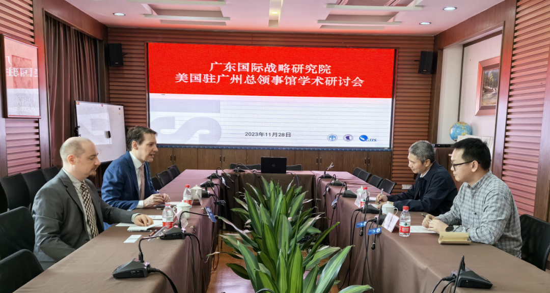 11月28日下午,美国驻广州总领事馆经济政治部主任冯海博(Eric Frater)和对外联络官员吴景安(Geoffrey Wessel)来访广东国际战略研究院。副院长周方银教授、外事秘书彭科明出席座谈交流。