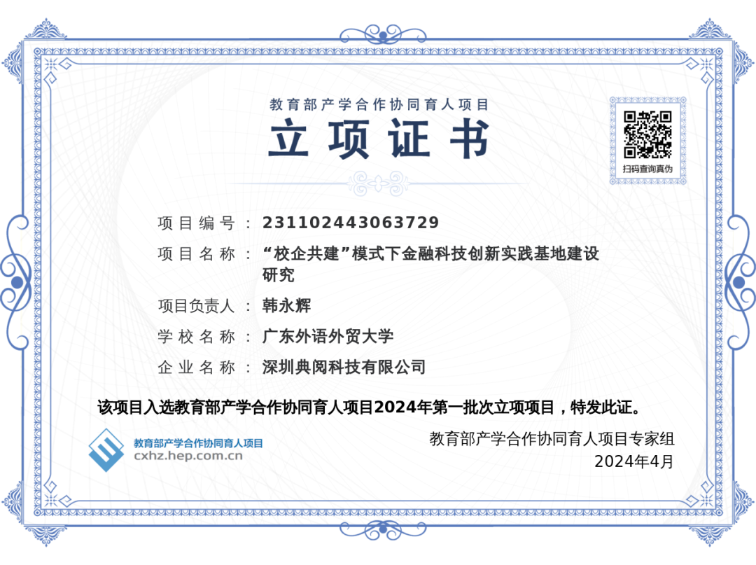 近日,教育部公布2024年第一批次产学合作协同育人项目立项项目,我院副院长韩永辉教授申报的项目《“校企共建”模式下金融科技创新实践基地建设研究》成功获批立项。本次获批的项目由深圳典阅科技有限公司提供专业技术支持,由我院负责具体项目实施。校企双方共同合作,致力于“校企共建”模式下金融科技创新实践基地建设研究。