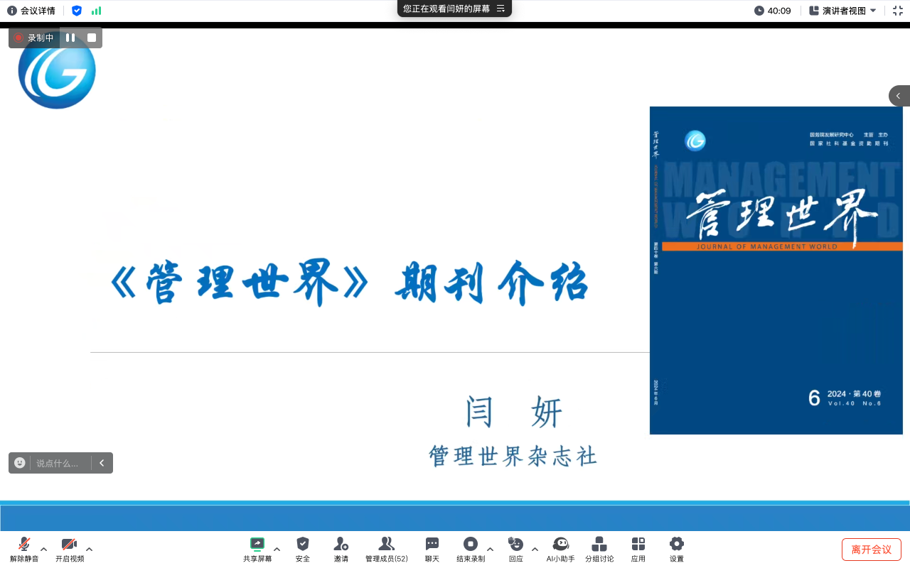 《管理世界》杂志社编辑部主任闫姸老师对期刊的基本情况做了简要介绍,并说明了期刊审稿程序以及所关注的选题。