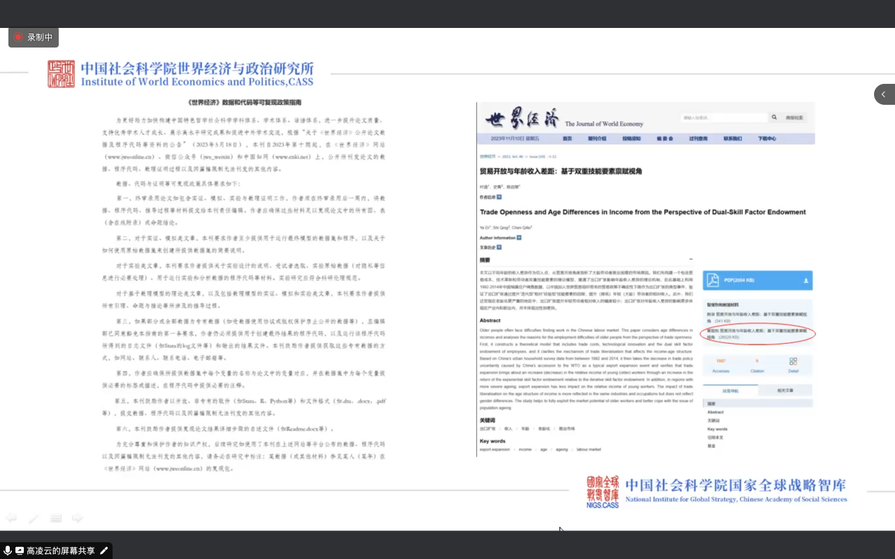 《世界经济》编辑部主任高凌云老师介绍了期刊的投稿审稿系统和期刊偏好,强调期刊看重论文的前沿性、创新性和时代性。他认为《世界经济》作为学术公共品平台的角色,促进了学术交流,并提出希望《世界经济》成为国内外学者交流对话的平台,引导学者进行有国际影响力的研究。