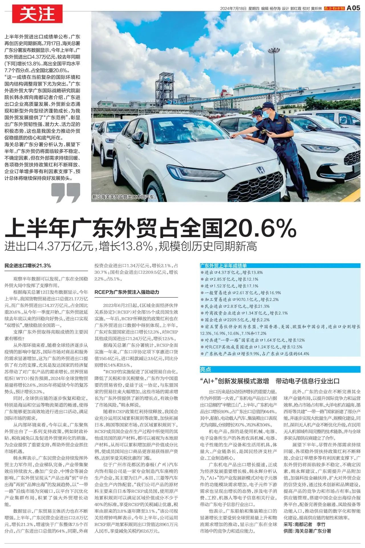 上半年外贸进出口成绩单公布,广东再创历史同期新高。7月17日,海关总署广东分署发布数据显示,今年上半年,广东外贸进出口4.37万亿元,较去年同期(下同)增长13.8%,高出全国平均水平7.7个百分点,占全国比重20.6%。就此,我院副院长韩永辉教授接受了《南方都市报》的采访。