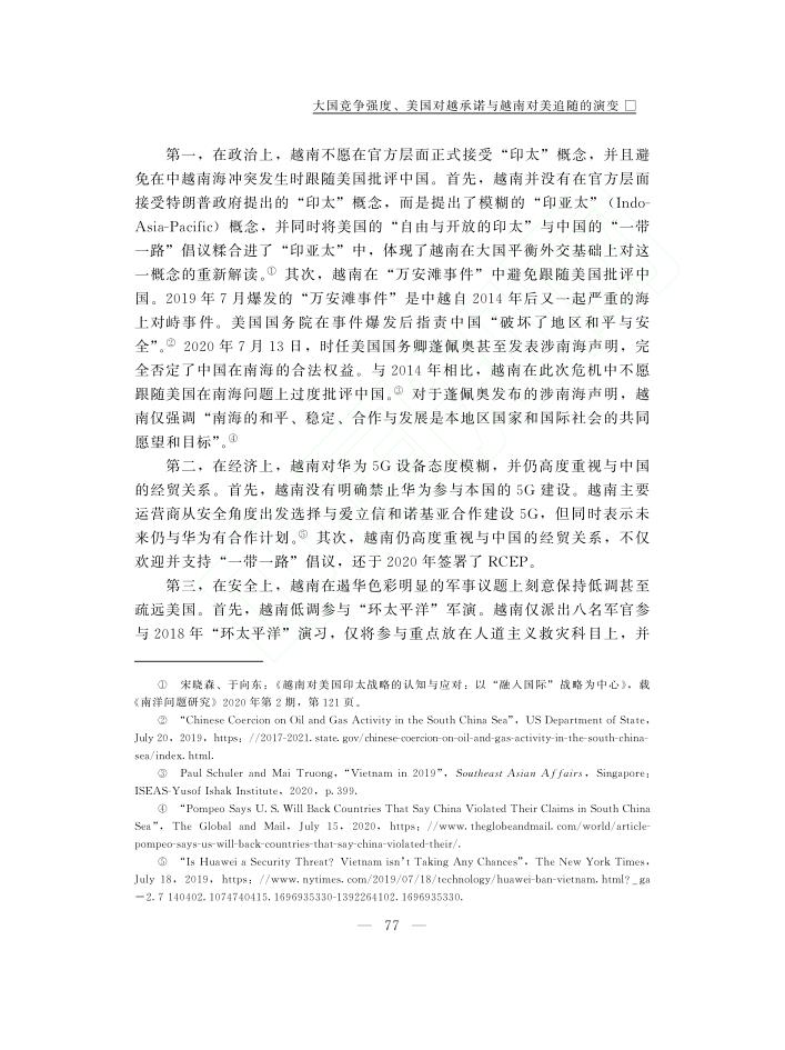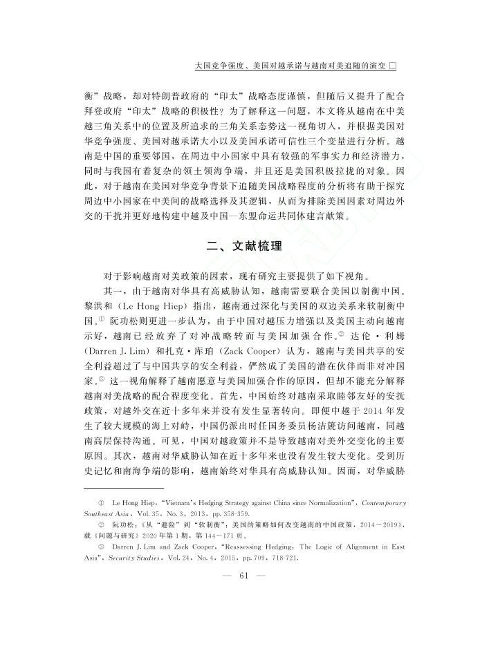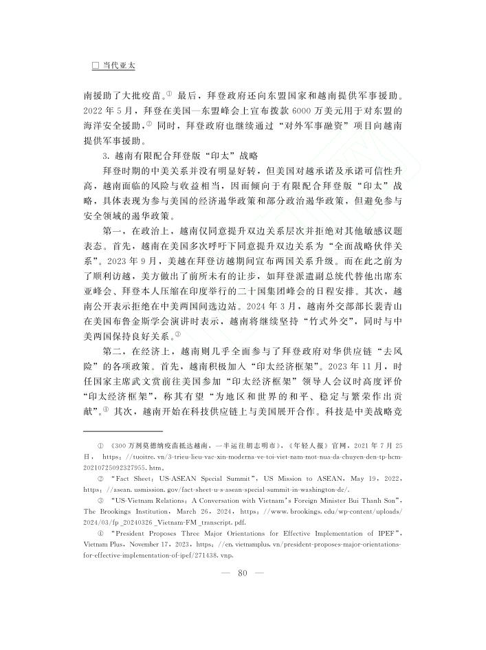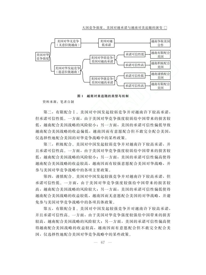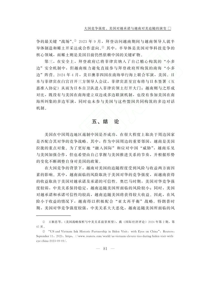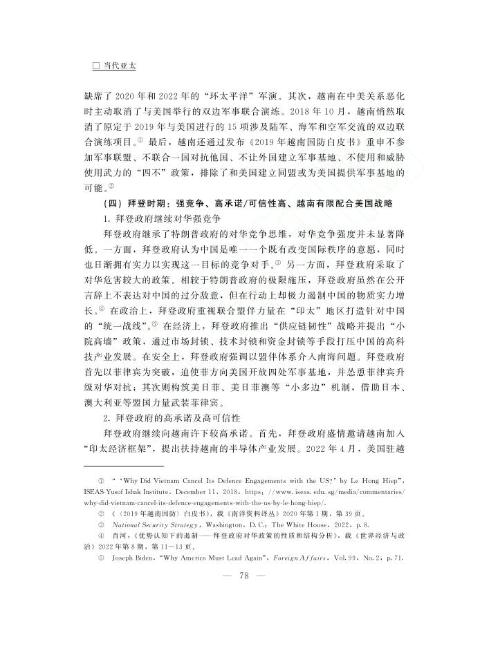 越南是美国发起对华战略竞争后积极拉拢的对象。然而,越南对不同时期的美国对华竞争战略却有着不同的回应。对 “亚太再平衡”战略表现出较高热情并积极配合,对特朗普版 “印太”战略态度谨慎,对拜登版 “印太”战略则有着一定热情并有限配合。越南对美国对华战略的态度,主要取决于美国对华战略的竞争强度与对越南的承诺及承诺的可信性。美国对华战略竞争强度决定了越南所遭受的风险大小;美国对越承诺及其可信性决定了越南所能获得的收益。奥巴马政府对华竞争强度小且对越南的承诺高/可信性高,使得越南在较小风险下可以 收 获 较 大 收 益,越 南 得 以 积 极 配 合“亚太再平衡”战略。特朗普政府对华竞争强度大但对越南的承诺可信性低,,使得越南在较大风险下收益有限,越南从而谨慎配合其 “印太”战略。拜登继续对华高强度竞争,但却提升了对越承诺可信性,使得越南在较大风险下的收益上升,使其愿意有限配合拜登政府的 “印太”战略。随着大国竞争长期化,越南将坚持更为审慎的 “竹式外交”,其政策行为将随中美关系的变化和美国对越政策的波动而变化。对此,中国应推进 “中越命运共同体”建设,并对越美政治配合与安全合作保持警惕。