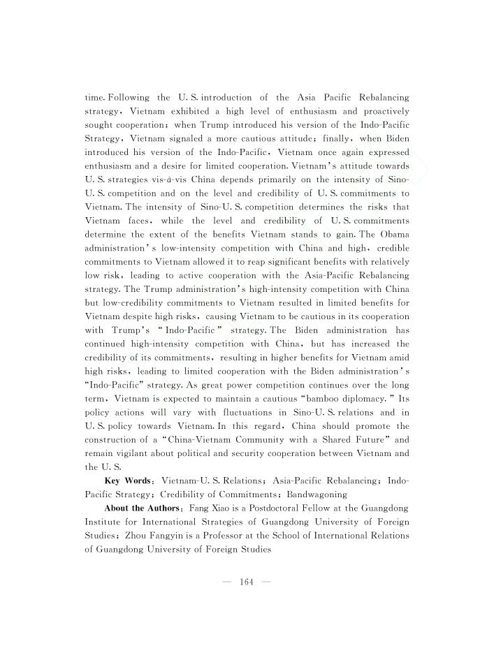 我院博士后方晓及我院副院长周方银教授合著的文章《大国竞争强度、 美国对越承诺与越南对美追随的演变》发表于《当代亚太》(CSSCI、一类B)。