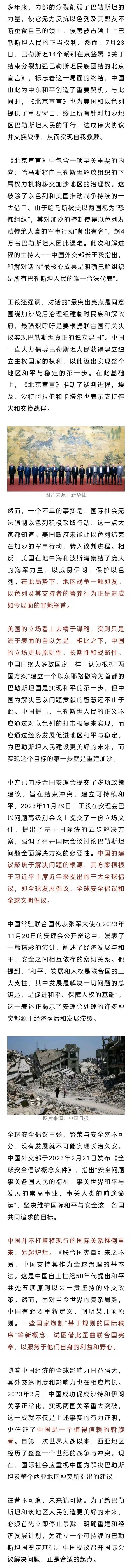 他表示,《北京宣言》的签署标志着巴勒斯坦内部分裂局面的终结,中国由此为中东和平创造了重要契机。此次和解进程的主持人——中国外交部长王毅指出,对话的“最突出亮点是同意围绕加沙战后治理组建临时民族和解政府,最强烈呼吁是要根据联合国有关决议实现巴勒斯坦真正的独立建国”。中国一直大力倡导巴勒斯坦人民获得建立独立主权国家的权利,以此迈出实现整个地区和平与稳定的第一步。为了给巴勒斯坦和该地区人民创造更美好的未来,必须首先立即停止杀戮,明确重建和经济发展计划,为建立一个可持续的巴勒斯坦国奠定基础。中国提议召开国际会议解决问题,正是合适的起点。