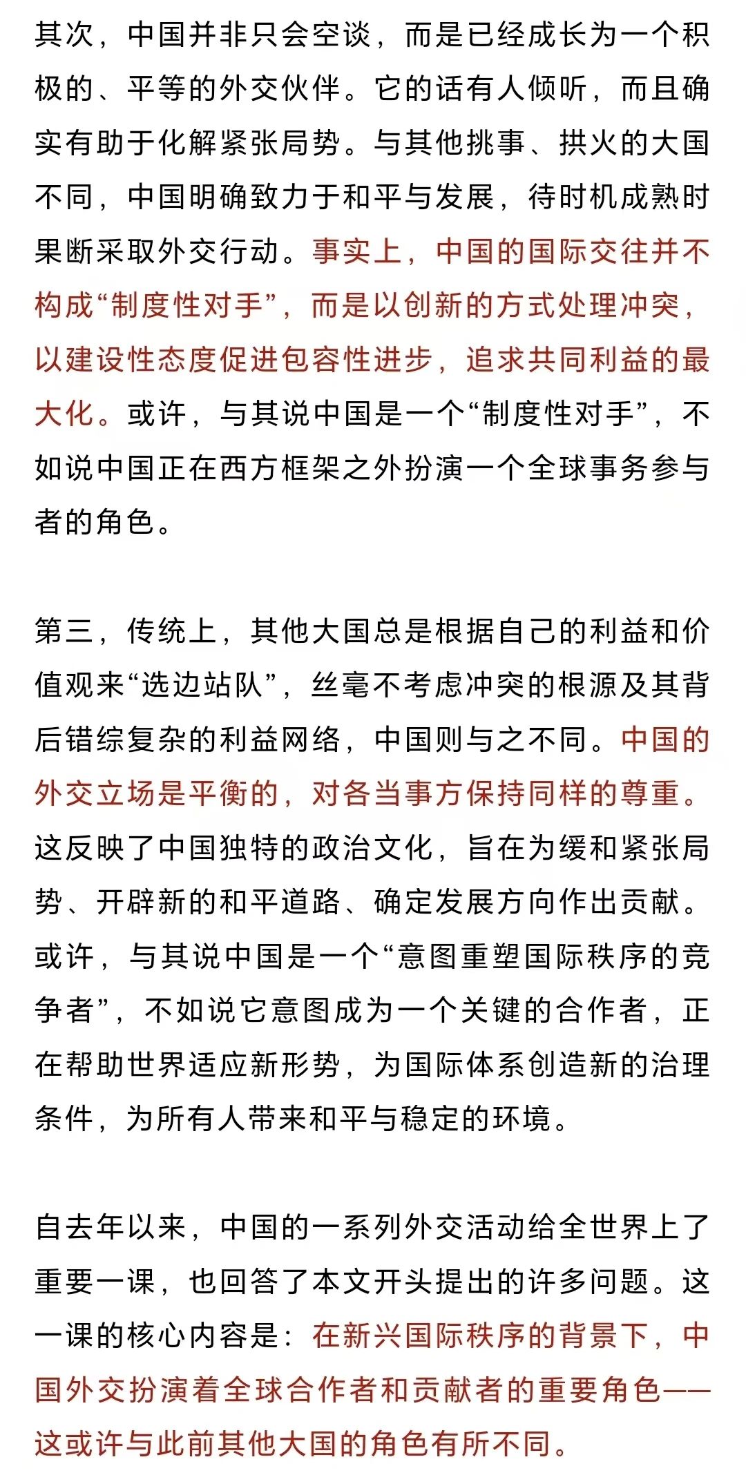 文章表示,一些西方政客和媒体极力将中国塑造成“全球安全威胁”的形象,然而事实上,近年来中国在中东和俄乌冲突中的外交调解努力表明,中国在国际舞台上并不对任何人构成“制度性对手”,而是重要的对话合作伙伴与和平建设者。中国不像其他大国那样简单地“选边站队”,而是秉持和平共处五项原则,以建设性态度促进包容发展,以创新的方式降低冲突,追求共同利益的最大化。