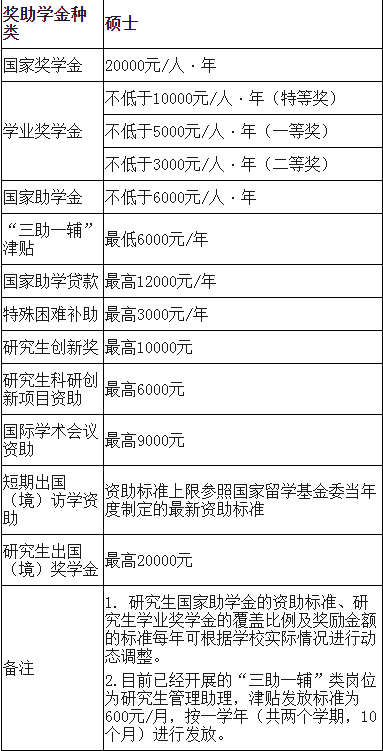 为了激励研究生安心学习、积极开拓创新,保障研究生的学习和生活,我校建立了以国家奖助为主,社会资助为辅,学校补助为补充的研究生奖助体系,基本做到多层次、宽渠道、高激励。目前,符合条件的硕士研究生每年最低可获得0.9万资助,累计最高超10万。(具体以学校实际发文为准)